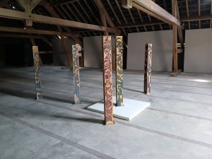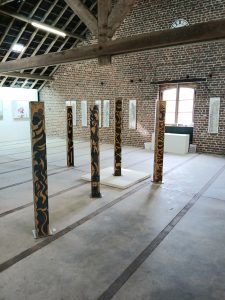Das Verhältnis von Figur… stellt sich bei Beate Bündgen als ein Ineinander dar. Auf dem unteren Teil ihrer Holzstelen ranken sich ornamentale Formen, die floral verspielt, labyrinthisch mäandernd oder geometrisch, fast architektonisch sein können.