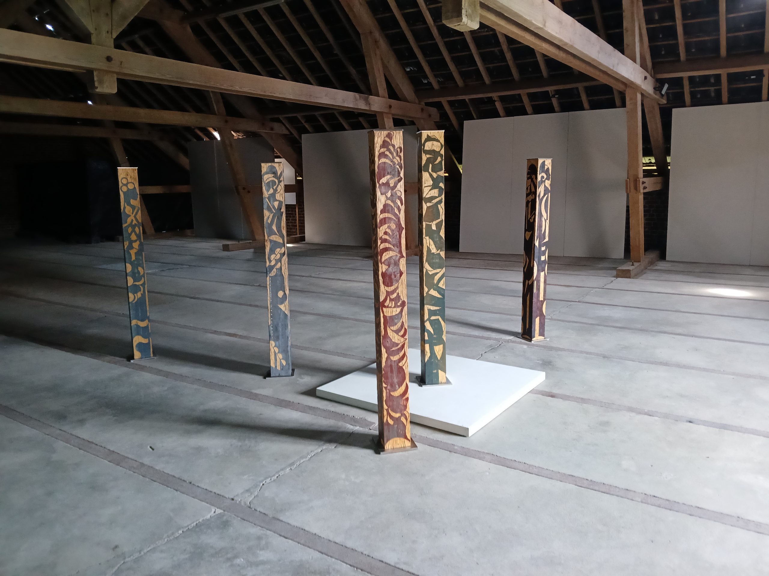 Es sind knapp menschengroße kantige Holzbalken, aus der jede Linie, jede Kuve mühevoll aus dem Material herausgearbeitet werden muss. Auf jeder der vier Seiten der Stele entsteht eine Zeichnung, die zugleich Druckstock ist. Während des Schnitzens hält die Künstlerin immer wieder inne, trägt Farbe auf die freigelegte Strukturen auf und druckt sie auf großformatige Papierbögen. So entstehen Druckgrafiken, die den Prozess der bildhauerischen Arbeiten zu verschiedenen Zeitpunkten festhalten.